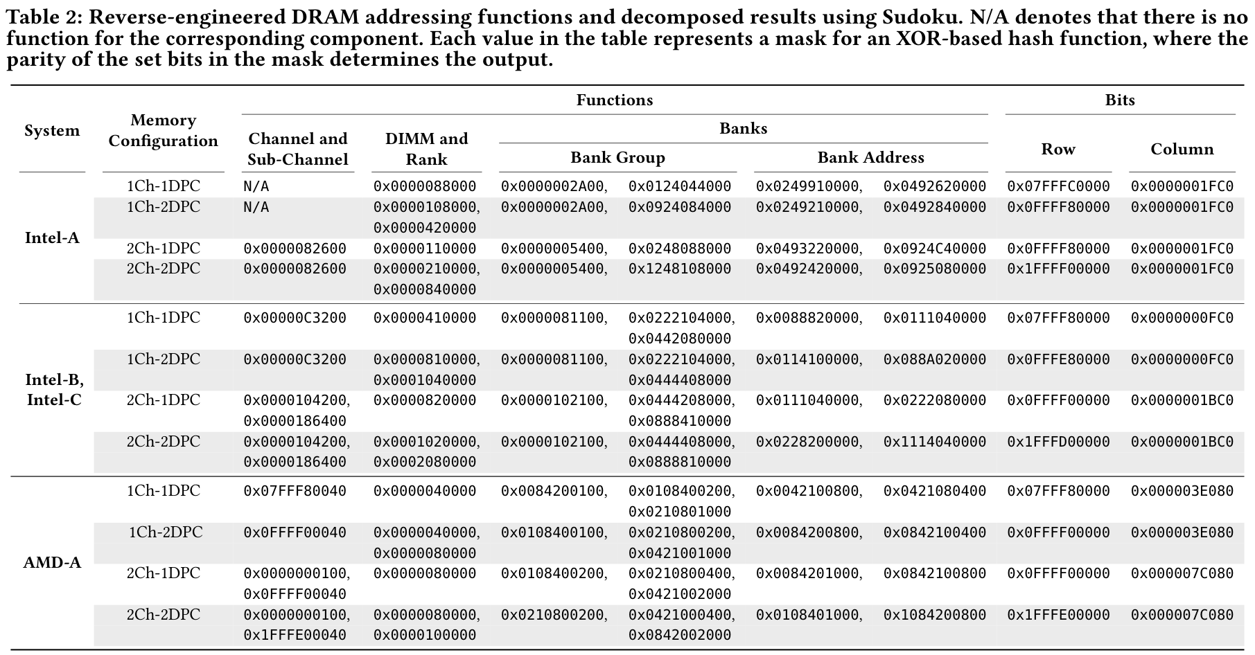 colindicates that the low 7 bits are used to indicate the column to read from.rowindicates that the high 16 or 17 bits determine the row to read from.- All other masks indicate that the xor of the indicated address-bits is taken, and the parity determines the channel/rank/group/bank. Each rank has 4 groups containing 4 banks each, so these get 2 bits assigned to them.